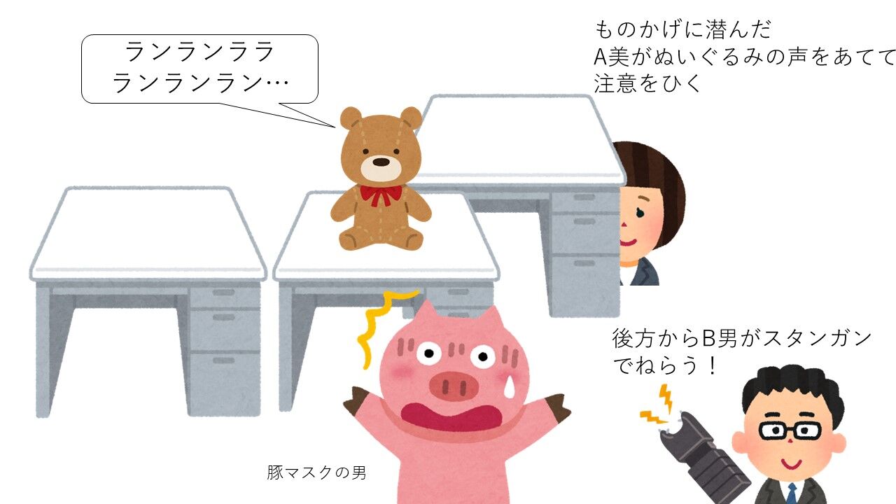 「あと、ぬいぐるみを事務所に置いておいて、A美ちゃんが声を出すとぬいぐるみがしゃべっているみたいになるので、男が事務所に来てぬいぐるみに注目したところをスタンガンでB男がねらいます」